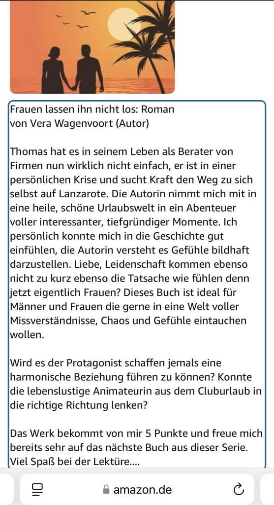 Die Veröffentlichung erfolgt unter meinem Pseudonym Vera Wagenvoort, einem Namen, der nicht nur für meine Liebesromane steht, sondern auch einen historischen Bezug zu meiner Familiengeschichte hat, der bis ins 16. Jahrhundert zurückreicht. Ich hoffe, dass „Frauen lassen ihn nicht los“ nicht nur unterhält, sondern auch dazu beiträgt, die Geheimnisse erfolgreicher Beziehungen zu entschlüsseln.